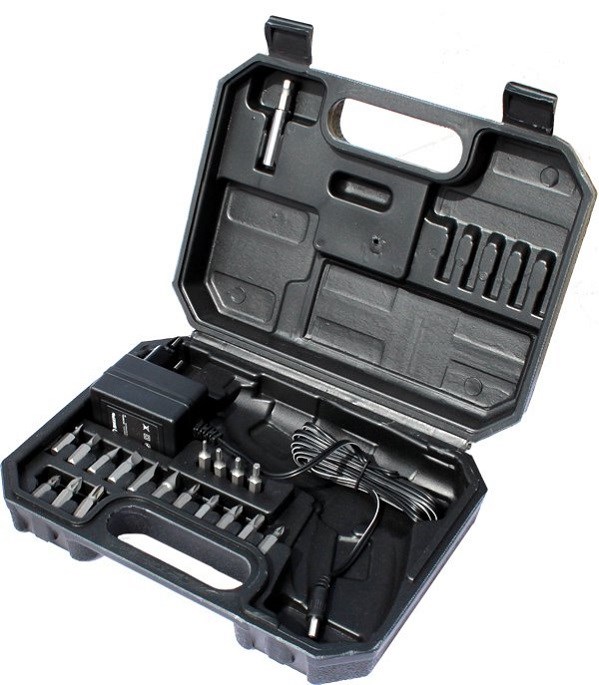 Отвертка со встроенным аккумулятором, Биты, Адаптер-удлинитель для бит, Сетевой адаптер, Паспорт, Кейс