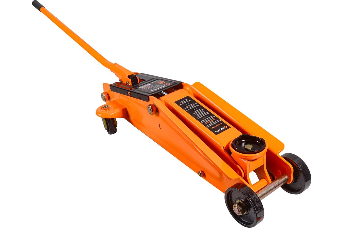 Гидравлический подкатной домкрат Вихрь ДМК-3 предназначен для поднятия транспортных средств весом до 3 т. Используется в процессе ремонта и шиномонтажа личного автомобиля и на СТО. Чтобы привести в действие гидравлический механизм, необходимо двигать рычаг. Длина рукоятки составляет 610 мм. Она является съемной, обеспечивая компактность при хранении и перевозке. Подъем автомобиля не требует больших усилий, домкрат позволяет работать в одиночку.Расстояние между поверхностью, на которой расположен инструмент, и его подхватом в нижнем положении составляет 135 мм. Высота подхвата соответствует дорожному просвету автомобиля от земли до точки касания с днищем. Максимальная высота подъема равна 435 мм, чего достаточно для удобной замены колеса.Подкатная конструкция подъемника весом 20 кг имеет вид низкой металлической тележки. Она оснащена 4 самонаправляющимися колесами для перемещения по ровной поверхности. Рабочий механизм состоит из гидравлического поршня, масляного насоса и ручного рычага. Система защиты от пере