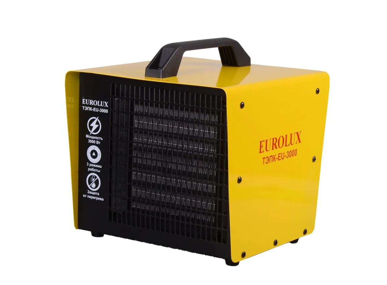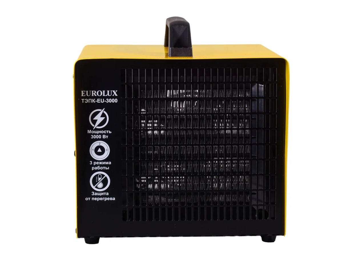 Компактная, но в то же время производительная модель электрической теплопушки Eurolux ТЭПК-EU-3000 – отличный вариант для обогрева помещений разного назначения, таких как, например, стройплощадка или производственный цех. Её мощность составляет 3кВт. Непосредственно нагрев осуществляется керамическим элементом, через который под большим напором, создаваемым вентилятором, проходит воздух. В теплопушке реализованы два режима работы: максимальный нагрев – 3 кВт, экономный – 1.5.Корпус тепловой пушки металлический, имеет квадратную форму и перфорированную решётку. Сверху имеется удобная пластиковая ручка. Органы управления в виде переключателей режимов работы и регулятора оборотов вентилятора вынесены на тыльную сторону. Установка модели Eurolux ТЭПК-EU-3000 напольная. Для исключения скольжения по напольным покрытиям предусмотрены ножки. Электрическая тепловая пушка работает от бытовой сети 220 В, 50 Гц.