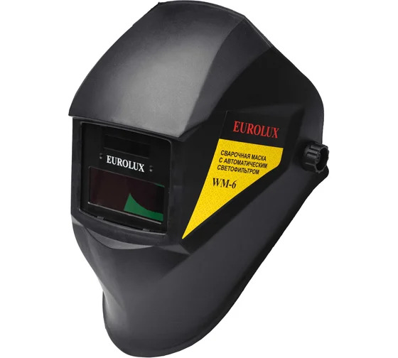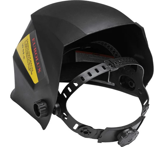 Сварочная маска Eurolux WM-6 используется для защиты глаз от световых бликов, искр и окалин. Смотровое окно размером 90х35 мм оснащено светофильтром типа «хамелеон», представляющим собой однослойный жидкокристаллический экран. Благодаря наличию 2 датчиков он мгновенно затемняется в момент зажигания дуги. Автоматический светофильтр самостоятельно меняет степень затемнения в зависимости от интенсивности светового потока. В светлом состоянии она равна 4 DIN, в темном - 11 DIN. Время переключения при температуре +20° С составляет 1,2 мс. Питание сварочной маски осуществляется с помощью солнечной и батареи CR2032. Она пригодна для эксплуатации при температуре от -5° до +55° C. Задержка открытия после окончания работы составляет 0,6 с. Этого достаточно, чтобы металл остыл и не представлял угрозу послесвечения для глаз. Сварочная маска Eurolux WM-6 подходит для выполнения строительно-ремонтных работ в быту. Выполнена из высокопрочного пластика, имеет малый вес 480 г. Конструкция маски с наголовным креплением позволяет надежно защищать лицо и шею от попадания искр. Это значительно удобнее, чем удерживание в руке. Регулировка системы крепления позволяет подстраиваться под окружность головы, создавая комфортные условия во время работы.