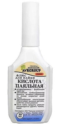 Флюс-люкс Кислота паяльная, сироп с улучшенной формулой и повышенной активностью (флакон пластик с кап. 30 мл. ). Активированные флюсующие свойства. Улучшенная комбинированная формула активных соединений на основе хлористых солей цинка. Сиропообразная консистенция обеспечивает высокую адгезию, удобство использования. После пайки продукты реакций рекомендуется удалять тканью или водой.
