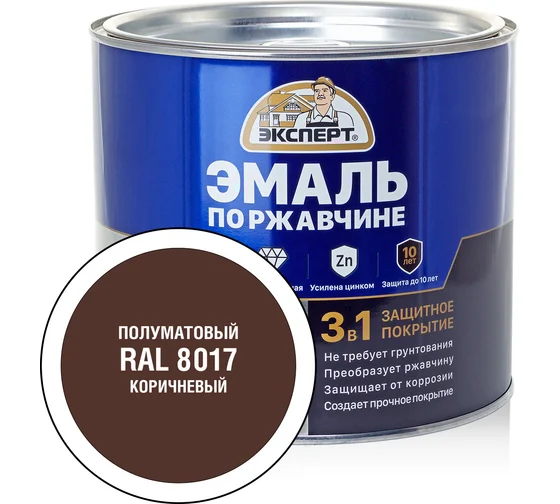 Эмаль ЭКСПЕРТ по ржавчине 3 в 1 применяется для защитно-декоративного окрашивания металлических, деревянных, бетонных и железобетонных конструкций без предварительного грунтования. Состав объединяет свойства 3 продуктов: преобразователя ржавчины, антикоррозионного грунта и декоративной эмали. Используют для внутренних и наружных работ. Преимущества: Для наружных и внутренних работ. Краска создана по формуле 3 в 1 (преобразователь ржавчины, грунтовка и декоративное финишное покрытие). Можно наносить прямо на ржавчину. Обладает хорошей укрывистостью. Преобразует ржавчину в прочный защитный слой. Препятствует дальнейшей коррозии. Образует атмосферостойкое покрытие. Усилена цинком. Быстросохнущая. Легкое нанесение (хорошо растекается). Защита металла до 10 лет.