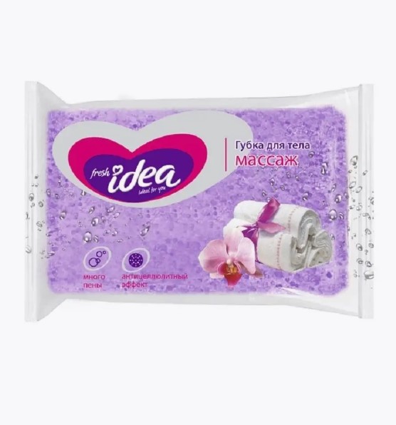 Возможно, имелась в виду губка для тела Fresh Idea «Массаж» размером 14×9×5 см. Назначение: для глубокого очищения и массажа кожи. Особенности: мягко отшелушивает ороговевший слой, удаляет омертвевшие клетки; делает кожу гладкой и сияющей; создаёт обильную пену; оказывает массажный эффект, который способствует улучшению кровообращения и упругости кожи; массажная структура помогает уменьшить видимость целлюлита. Материал: поролон. Подходит для всех типов кожи. Губка быстро сохнет и легко очищается.
