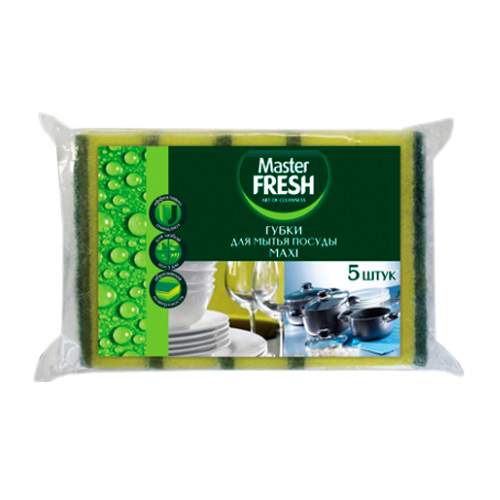 Губки для мытья посуды Master FRESH MAXI, 5шт, микс яркие цвета С0005790 эффективны благодаря абразивному слою.Поролон отлично впитывает воду и моющее средство, отлично его распеневая.Долгий срок службы обеспечивается за счет плотного поролона и суперпрочного клеевого слоя.