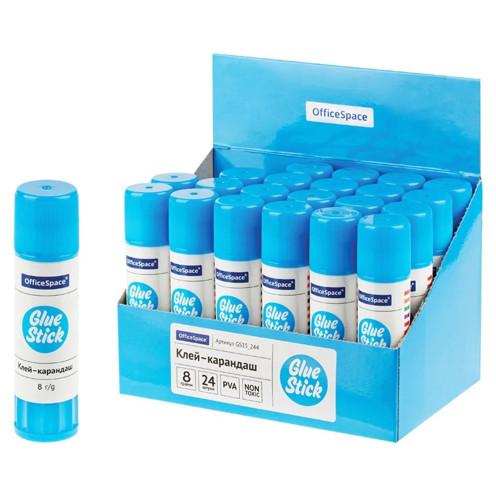 Клей-карандаш ПВА OfficeSpace белого цвета подходит для склеивания бумаги и картона. Вес - 8 граммов. В картонном дисплее 24 штуки. Является незаменимым помощником для работы в офисе, а также для школы и детского творчества. Клей морозоустойчив. Клей в удобной для хранения круглой форме корпуса.