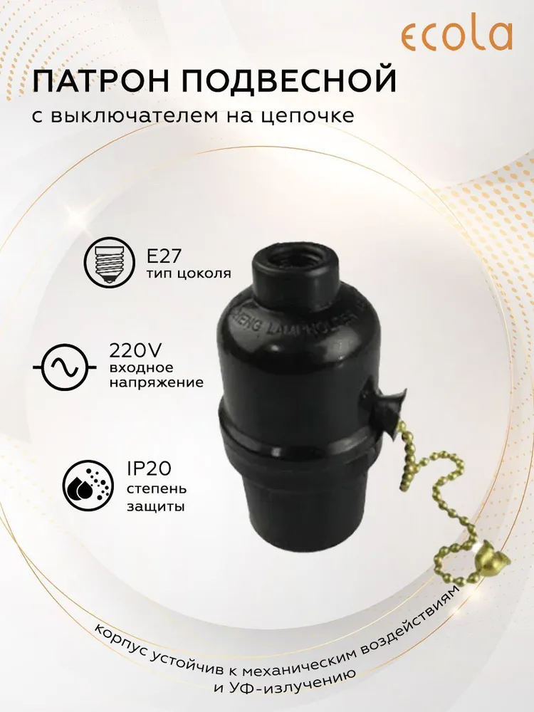 Патрон ECOLA подвесной с выключателем на цепочке карболит E27 Черный Патрон ECOLA подвесной с выключателем на цепочке карболит E27 Черный является незаменимым комплектующим элементом для светильников, световых коробов, рекламных конструкций и стендов. Он отличается простотой монтажа, надежностью и долговечностью эксплуатации, что делает его идеальным выбором для любого проекта. Основное преимущество данного патрона заключается в его высоких электроизоляционных свойствах. Он способен выдерживать высокие нагрузки и обеспечивать надежное соединение с лампой. Корпус патрона изготовлен из прочного материала - карболита, который обладает высокой устойчивостью к механическим воздействиям и УФ-излучению. Цоколь патрона - E27, что позволяет использовать широкий спектр ламп с таким же цоколем. Вы сможете выбрать именно ту лампу, которая идеально подойдет для вашего проекта или дизайна. Артикул патрона - AB7SWBEAY. Патрон ECOLA подвесной с выключателем на цепочке карболит E27 Черный - это надежное и функциональное решение для вашего осветительного проекта. Не упустите возможность использовать его в своей работе и насладиться качественным и эстетичным освещением.
