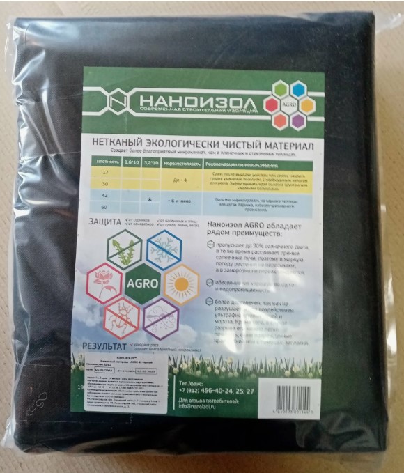 «Наноизол AGRO 60» — это укрывной материал, который предназначен для защиты растений в теплицах, парниках и на грядках. Некоторые свойства материала: создаёт благоприятный микроклимат для роста растений; защищает от заморозков, холодной росы, сильных осадков и града; защищает от внешних болезней, птиц и насекомых-вредителей; снижает норму полива за счёт уменьшения испарения влаги; защищает растения от прямых палящих солнечных лучей (создаёт рассеянный свет); ускоряет сроки получения урожая на 2 недели; продлевает период вегетации до глубокой осени.