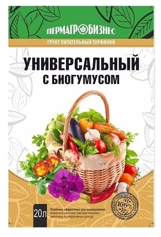 «Пермагробизнес» грунт Универсальный с БИОГУМУСОМ объёмом 20 литров в пакете — полностью готовый питательный грунт.