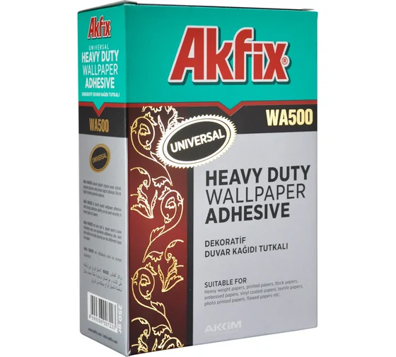 Akfix WA500 предназначен для флокированных, печатных, виниловых, тяжелых и тисненых обоев (дерево, джут, шелк, ткани и т.п.), текстильных обоев, дефектных отрывных бумаг, а также других специальных обоев. свойства Высокая устойчивость к влаге; может сглаживаться во время склеивания, адаптация к изменению тепла; не вступает в реакцию с известью и цементом Прост и удобен в применение. Легко растворяется в воде,быстро набирает высокую вязкость. Позволяет корректировать положение приклеиваемого материала. Содержит антигрибковые и антибактериальные добавки. Область применения Используется для всех типов обоев, баннеров, постеров, билбордов, афиш, текстильных материалов, бумажных материалов с виниловым покрытием, фотографий, текстурированных бумажных изделий и др.