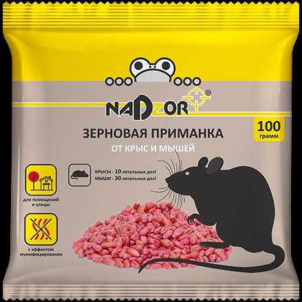 Универсальная приманка для уничтожения мышей и крыс. Основу составляет зерно, которое так любят грызуны. Активное действующее вещество последнего поколения обеспечивает гибель грызунов на 3-7 день после однократного поедания ими приманки.