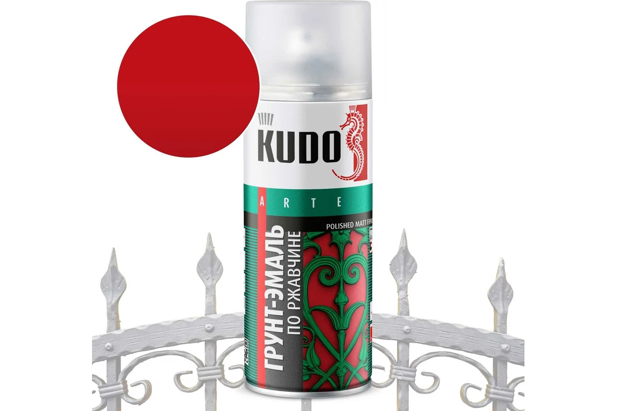 Грунт-эмаль аэрозоль по ржавчине KUDO предназначена для окрашивания изделий из сплавов чёрных металлов, которые подвержены коррозии и уже заржавели. Продукт сочетает в себе свойства нейтрализатора коррозии, грунта и декоративной эмали, что позволяет значительно сократить время для получения покрытия.