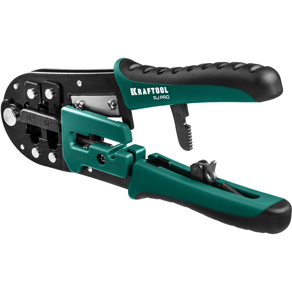 RJ кримпер универсальный 22698 фирмы KRAFTOOL - высококачественный ручной инструмент для электромонтажных работ.Данный инструмент предназначен для работы с проводами, а именно: соединение их между собой, с контактами разъемов и наконечниками.