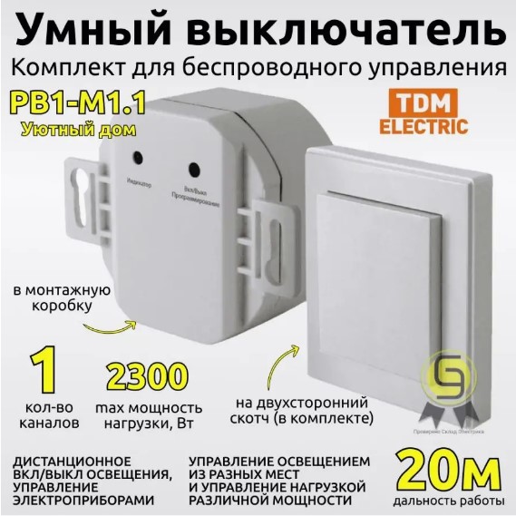 Назначение комплекта для беспроводного управления нагрузкой «Умный выключатель» РВ1-М1.1 TDM дистанционное включение и отключение освещения и электроприборов на расстоянии до 30 метров. Некоторые области применения: торшеры, настольные лампы, электрочайники, электрообогреватели и другое электрооборудование.