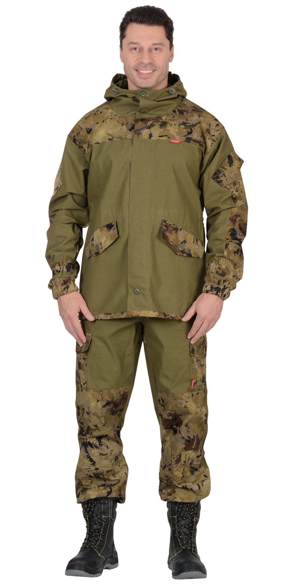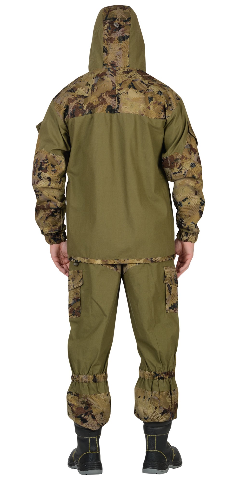Куртка удлиненная прямого силуэта, с супатной застежкой на пуговицы, с втачным капюшоном с козырьком, с усилительными накладками, с прорезными карманами листочка и фигурными клапанами на пуговицу, с внутренним карманом. Рукава с накладными полу объёмными карманами и фигурными клапанами на липучку, с манжетами частично стянутыми на резинкой. Куртка по линии талии частично стянута резинкой, понизу куртка регулируется шнуром и двойным фиксатором. Брюки прямого силуэта, с пристёгивающимися помочами (подтяжки), с гульфиком застегивающийся на пуговицы, с цельнокроеным поясом частично стянутый резинкой и застегивающийся на пуговицы, с разными многофункциональными карманами. С усилительными накладками. Низ брюк на резинке.