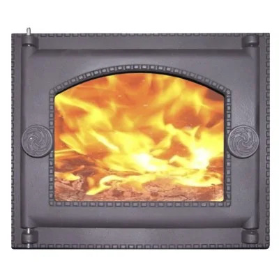 Крышка дверок может быть с чугунной вставкой, украшенной барельефным рисунком и с жаростойким стеклом ROBAX. Стекло выдерживает тепловые нагрузки до 760 градусов Цельсия. При этом можно любоваться пламенем и визуально контролировать процесс горения.