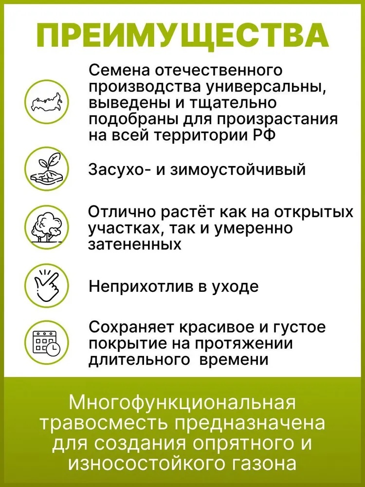 Многофункциональная травосмесь «Футбольный ковёр»— это тщательно подобранный состав трав, который обеспечит создание красивого газона как на открытых участках, так и в условиях умеренного затенения. Благодаря сбалансированному составу, газон, выращенный из этой травосмеси, будет обладать повышенной устойчивостью к вытаптыванию, а также сохранит насыщенный зелёный цвет в течение всего сезона. Травосмесь содержит семена трав с сильной и крепкой корневой системой, что обеспечивает надёжное сцепление с грунтом и защиту от сорняков. Простота выращивания и неприхотливость в уходе делают эту травосмесь идеальным решением для обустройства детских площадок, спортивных полей и других территорий с высокой проходимостью. Сочетание трав обеспечивает быстрое развитие корневой системы, активный рост зелёной массы и устойчивость к неблагоприятным погодным условиям. Для достижения наилучших результатов рекомендуется подготовить почву к засеву, внести комплексное минеральное удобрение и обеспечить регулярный полив. Обратите внимание! Для получения качественного газона важно соблюдать технологию выращивания и рекомендации по уходу за растениями. Перед использованием продукта необходимо внимательно ознакомиться с инструкцией на упаковке. Создавайте красивые газоны с травосмесью «Футбольный ковёр»!