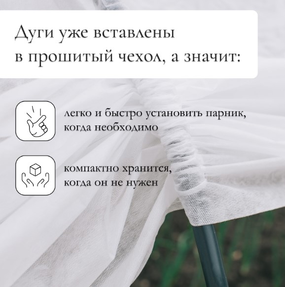 Парник предназначен для укрытия растений, цветов и декоративных культур. Некоторые преимущества использования такого парника: защищает растения от ветра, града, заморозков, солнечных лучей; поддерживает оптимальный микроклимат, вода поступает к корням даже при низкой температуре (от 0 до +8 °С); пропускает свет; защищает сельскохозяйственные культуры от мелких вредителей, птиц; удерживает влагу, снижает потребность в поливе по сравнению с выращиванием в грунте.