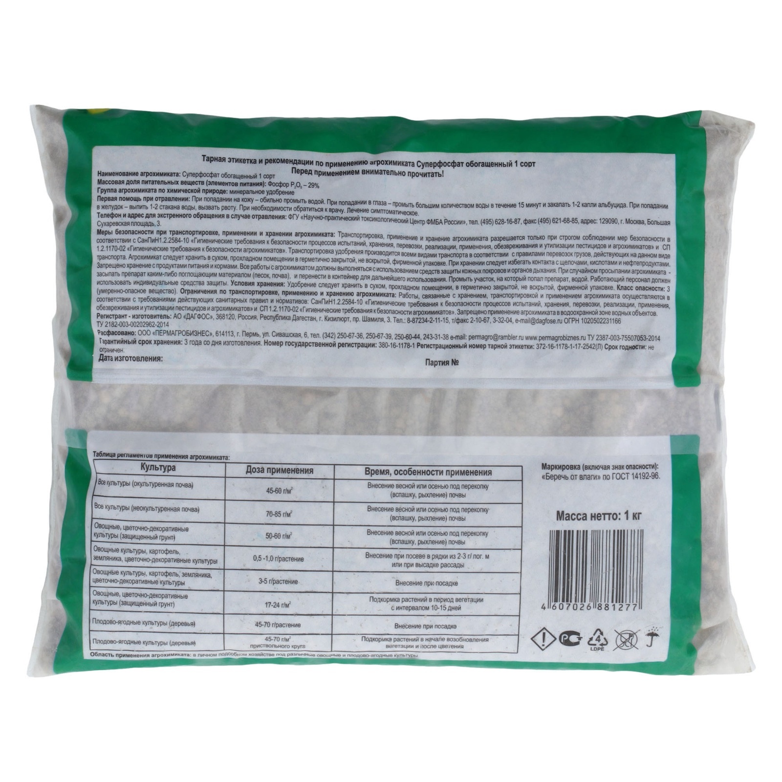 Фосфорное, концентрированное, водорастворимое удобрение. Применение суперфосфата помогает растению быстрее вступить в период плодоношения, улучшает вкусовые качества плодов и ягод, положительно влияет на развитие корневой системы и клубней. Введение гуматов позволяет повысить эффективность усвоения минеральных компонентов удобрения за счет перевода их в более доступную для растений форму. Суперфосфат совместим со всеми минеральными и органическими удобрениями. Удобрение применяется во всех почвенно-климатических зонах в качестве источника фосфора и азота при выращивании любых культур в открытом и закрытом грунте. Обладает пролонгированным действием. Способствует быстрому наращиванию мощной корневой системы растений. Ускоряет рост и развитие растений. Укрепляет иммунную систему растений. Обеспечивает обильное и длительное цветение. Идеально для овощных, плодовых, ягодных и декоративных культур.