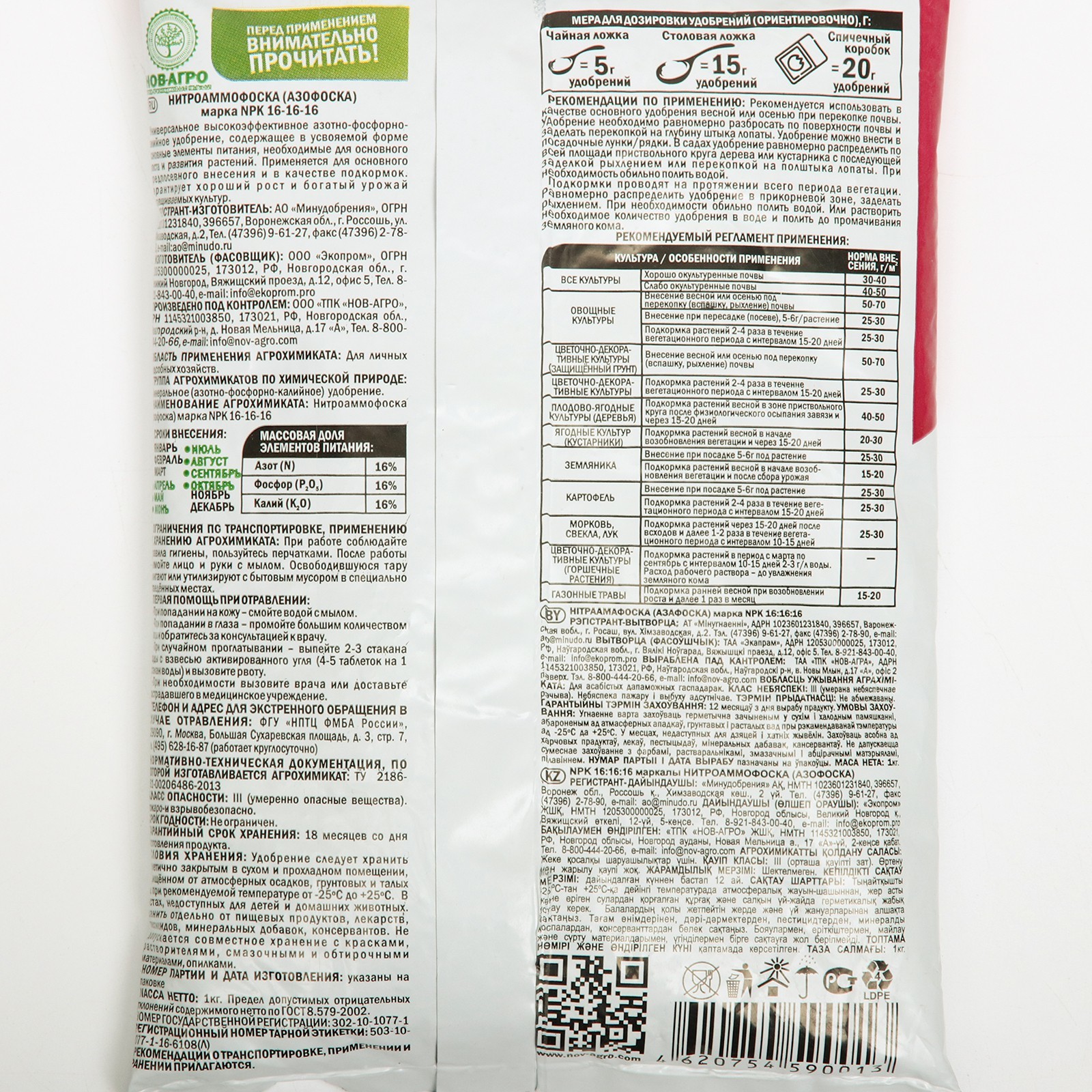 Азофоска — высокоэффективное полное минеральное удобрение, содержащее в усвояемой форме основные питательные элементы, необходимые для роста и развития растений - азот, фосфор, калий. Применяют для основного, допосевного и местного внесения в рядки при посеве, а также для подкормки растений. Состав: N-16%, P2O5 – 16%, K2O – 16%.
