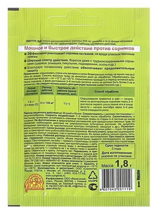 Мощное и быстрое действие против сорняков. Защищает все основные зерновые культуры, а также злаковые газонные травы. Широкий спектр действия, борется даже с трудноискоренимыми сорняками, такими как марь, щирица, ромашка, пикульник, подмаренник, осоты и др. Благодаря почвенному действию обеспечивает продолжительную защиту. Состав: водно-диспергируемые гранулы) 659 г/кг дикамба, к-та (в форме натриевой соли) и 41 г/кг триасульфурон. Срок хранения: 3 года.