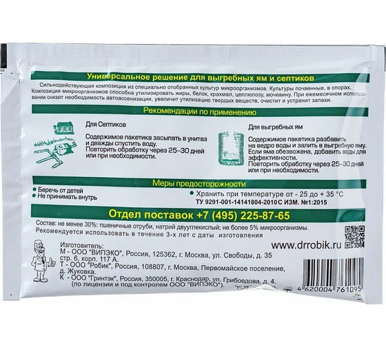 Биоактиватор для выгребных ям и септиков Доктор Робик 109 имеет в составе культуры почвенные в спорах, способны в течение короткого времени утилизировать бумагу, фекалии, жиры, белки, целлюлозу, мочевину, крахмал. Регулярное применение раз в месяц поможет избежать заиливания пор в земле, образования окаменелостей и нерастворимых органических отложений в септиках и выгребных ямах. Один пакетик (75 г) рассчитан на 30-40 дней для резервуара 1500 литров.