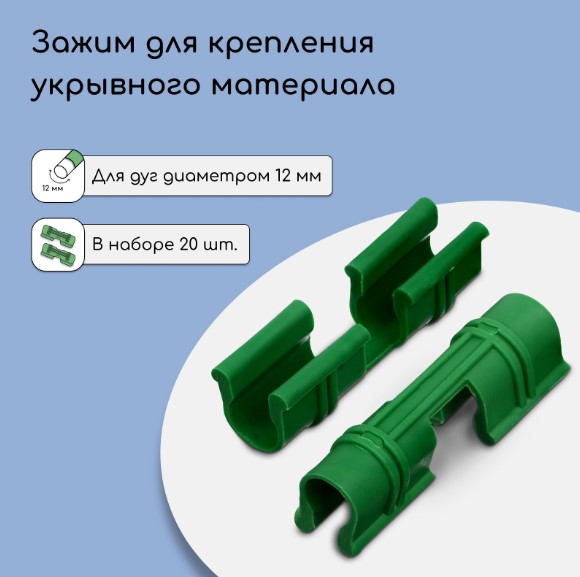 Клипсы для крепления укрывного материала предназначены для закрепления укрывного материала (плёнки, спанбонда и т. д.) на каркасе парника диаметром 12 мм. Такие зажимы помогают сэкономить время при монтаже и демонтаже, сохранить целостность укрывного материала и обеспечить его надёжное крепление к каркасу.