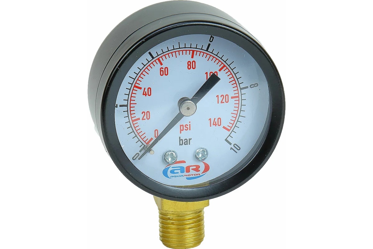Манометр радиальный 10 атм, 50 мм необходим для контроля давления воды в трубопроводах, насосах и насосных станциях. Оснащен шкалой от 0 до 10 бар и стрелкой для указания величины давления.