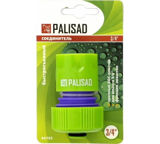 Пластмассовый быстросъемный соединитель Palisad 66165 с клапаном «аквастоп» совместим со шлангами диаметром 3/4"" и позволяет подключать их к распыляющим насадкам. Будет полезен при монтаже системы орошения на дачном участке.