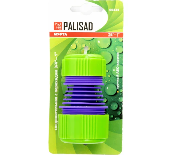Пластмассовая соединительная муфта Palisad 66434 с переходом 3/4-1 дюйм обеспечивает возможность создания оросительной системы из шлангов разного размера. Благодаря этому можно удлинить линию для полива больших территорий.