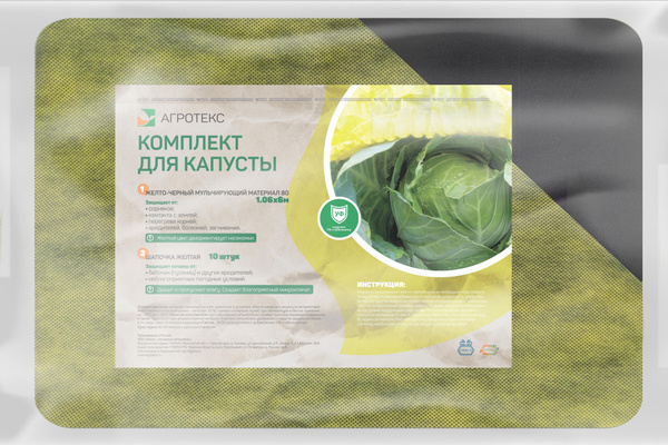 «Агротекс Комплект для капусты» предназначен для мульчирования капусты и дополнительной защиты кочанов в теплицах и открытом грунте. Некоторые цели использования: получение раннего урожая; защита от насекомых; экономия на прополке; минимизация испарения влаги из-под материала, что позволяет сократить объём полива. В комплект входят: Жёлто-чёрный мульчирующий материал «Агротекс 80» (размер 1,06х6 м). Верхний жёлтый слой отвлекает на себя вредителей, а нижний чёрный слой поглощает солнечный свет, прогревает почву и сдерживает рост сорняков. 10 жёлтых шапочек для капусты. Шапочки выступают в роли дополнительной защиты листьев и кочанов от бабочек-белянок. Комплект рассчитан на грядку размером 6х1 метр, на которой размещено 10 растений.