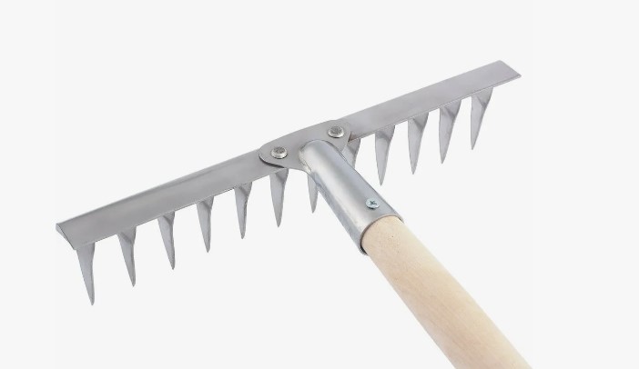 Грабли «Сибртех». Это стальные грабли длиной 1300 мм, с 12 витыми зубьями и шириной гребенки 300 мм. Назначение: уборка с газонов и грядок листвы и мусора, а также проведение аэрации почвы. Особенности: рабочая часть и тулейка изготовлены из конструкционной углеродистой стали, зубья утолщены, поэтому грабли выдерживают большие нагрузки; порошковое покрытие предотвращает появление коррозии, продлевая рабочий ресурс инструмента; зубья имеют витую конфигурацию, поэтому эффективно разбивают комья земли и обеспечивают насыщение почвы кислородом. Грабли поставляются в сборе с деревянным черенком, диаметр крепления — 30 мм, вес — 0,9 кг.