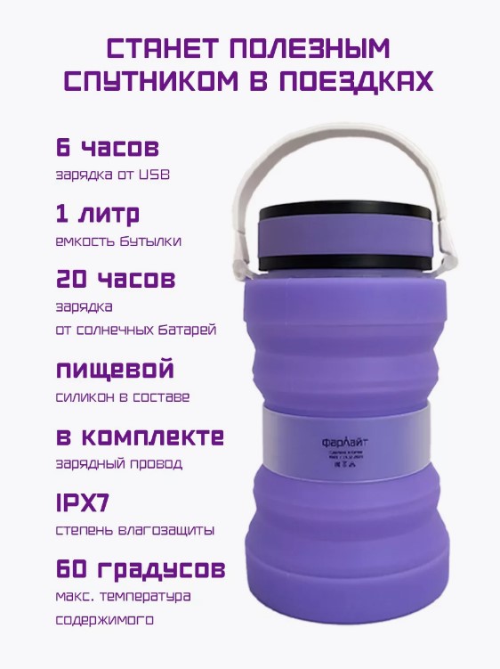 Фонарь-бутыль силиконовая складная с солнечной батареей «Фарлайт» — кемпинговый фонарь, который подходит для походов и кемпинга. Емкость бутылки 1 литр.