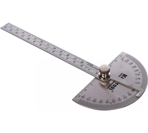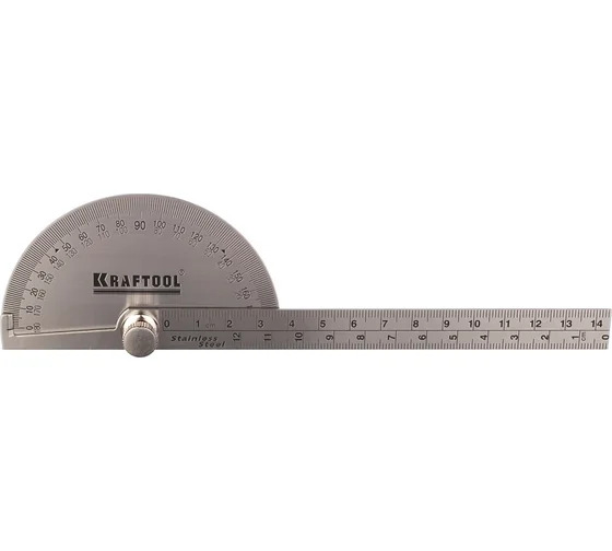 Транспортир с линейкой KRAFTOOL Protractor из нержавеющей стали, 145 мм 34290 - ручной инструмент, предназначенный для проведения различных измерений. Данная модель оснащена линейкой, что позволяет измерять не только углы, но и различные габариты. Изготовлен из нержавеющей стали, на прецизионном оборудовании. Обладает высокой точностью и длительным сроком службы.