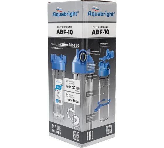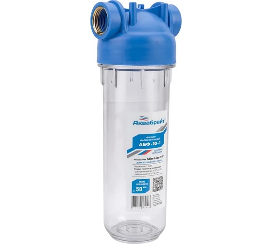 Магистральный фильтр для холодной воды Аквабрайт SL10, 1" (Прозрачная колба) АБФ-10-1 TMFC0100 бытового использования, предназначен для подключения к водопроводной сети холодного хозяйственного-питьевого водоснабжения. Магистральный фильтр способен: Удалять механических примесей, песка, ржавчины, окалины и коллоидных взвесей. Устранять мутность воды. Защищать краны, смесители и бытовые приборы от преждевременного выхода из строя.