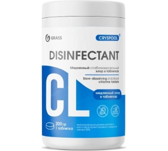 Средство дезинфицирующее для воды CRYSPOOL медленный стабилизированный хлор пролонгированного действия в таблетках (1кг) 150019 Таблетки белого цвета массой 200гр без видимых примесей, с характерным запахом хлора, средство предназначено для обеззараживания воды плавательных бассейнов и аквапарков. Обладает бактерицидной и вирулицидной активностью. Эффективно в отношение грамотрицательных и грамположительных спорообразующих и не спорообразующих бактерий.