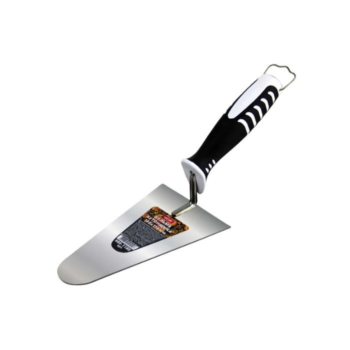 Удобная кельма с эргономичной двухкомпонентной ручкой для нанесения строительных смесей. Сделана из нержавеющей полированной стали 1,2мм.