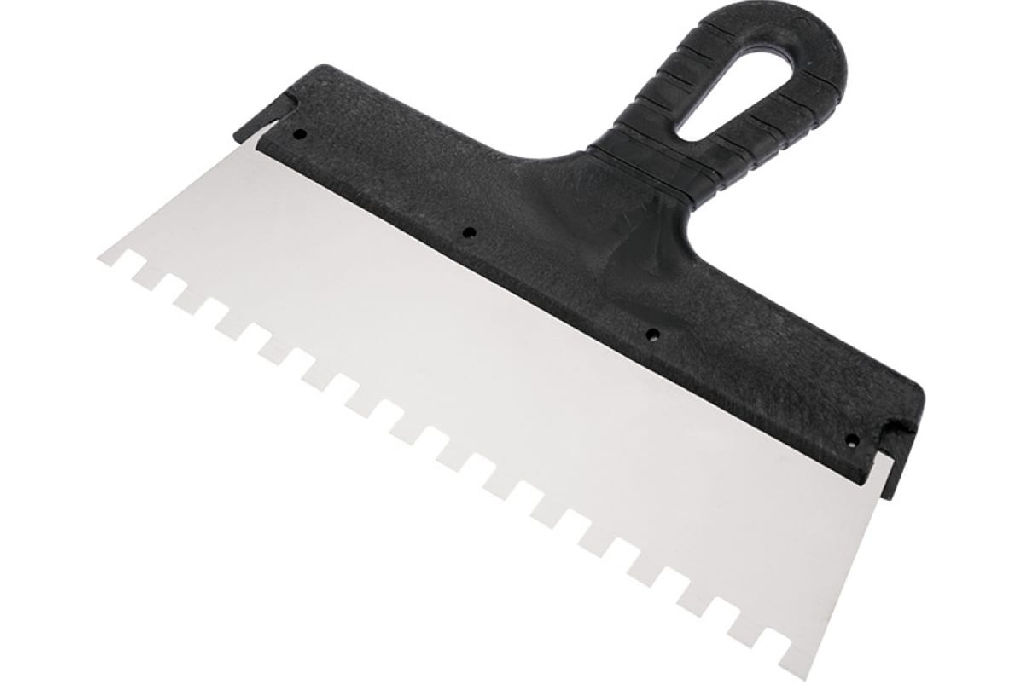 Зубчатый шпатель DECOR серии Black Edition имеет полотно из нержавеющей стали и пластиковую черную ручку. Предназначен для работы с клеящими составами при облицовке поверхностей плиткой и декоративным камнем.