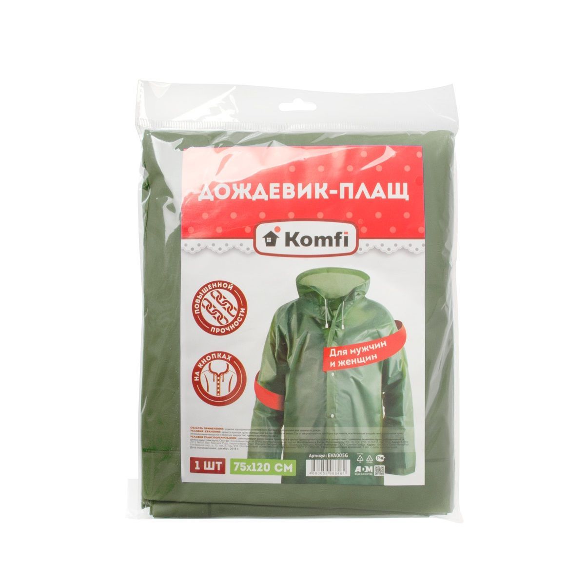 Дождевик плащ ЕВА (75х120 см) - многоразовый плотный плащ на кнопках. Дождевик прочный и идеально подойдет для отдыха на природе, туристических походов, рыбалки, пикника. Непромокаемый плащ идеален и для городских прогулок. Дождевик водонепроницаемый, т.к. произведен методом горячей пайки из водонепроницаемого и экологически чистого материала EVA. Материал EVA не вызывает аллергических реакций и эластичнее, легче полиэтилена. В сложенном виде, плотный плащ дождевик будет компактен в Вашей сумке. Имеет свободный фасон, что позволяет надеть дождевик поверх практически любой одежды.