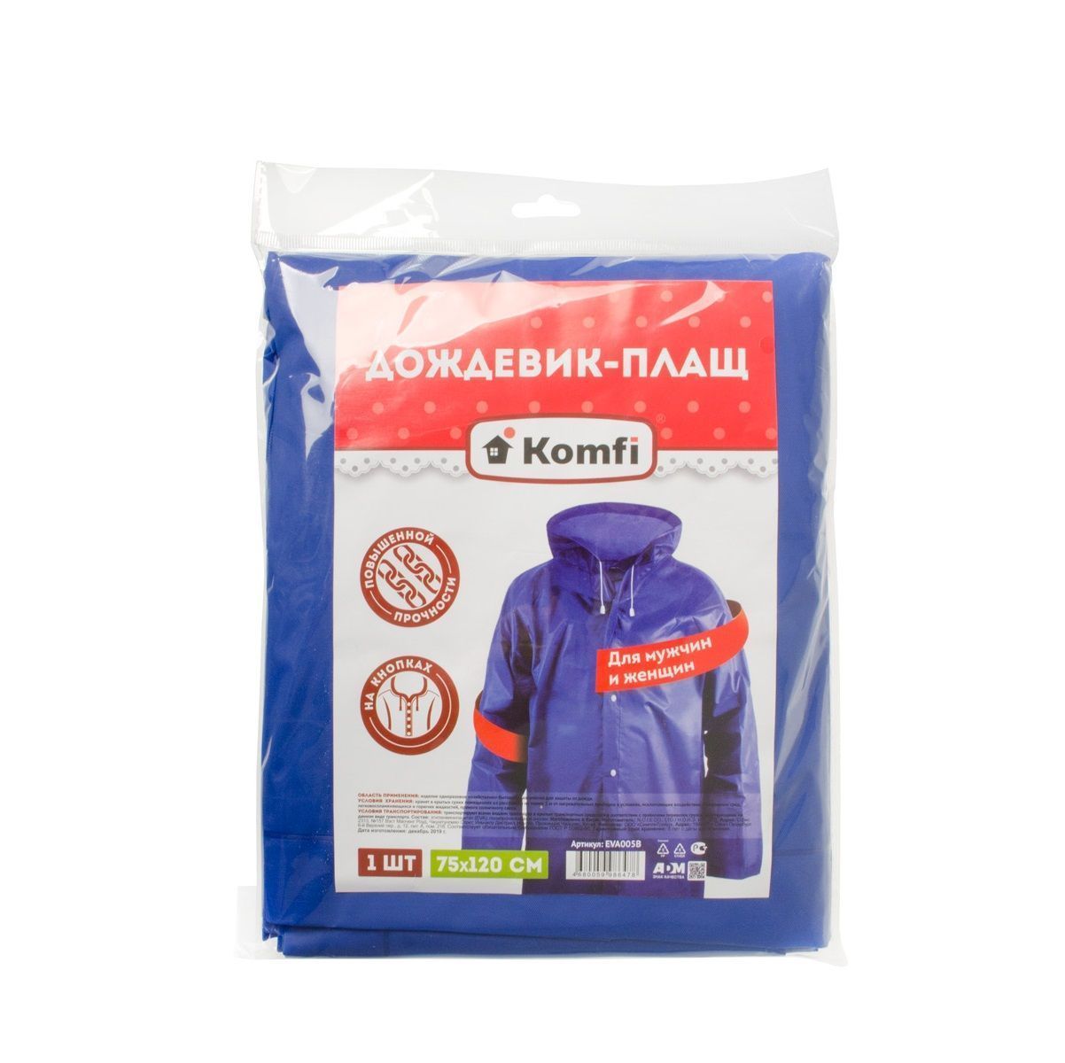 Дождевик плащ ЕВА (75х120 см) - многоразовый плотный плащ на кнопках. Дождевик прочный и идеально подойдет для отдыха на природе, туристических походов, рыбалки, пикника. Непромокаемый плащ идеален и для городских прогулок. Дождевик водонепроницаемый, т.к. произведен методом горячей пайки из водонепроницаемого и экологически чистого материала EVA. Материал EVA не вызывает аллергических реакций и эластичнее, легче полиэтилена. В сложенном виде, плотный плащ дождевик будет компактен в Вашей сумке. Имеет свободный фасон, что позволяет надеть дождевик поверх практически любой одежды.