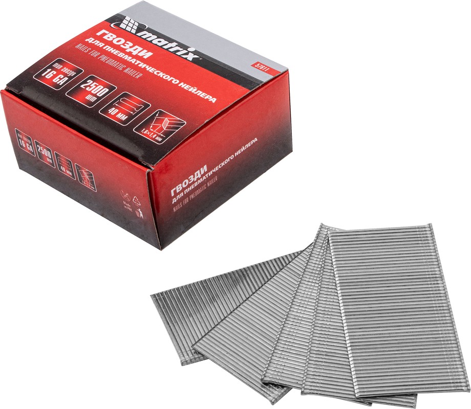 Гвозди Matrix 16 GA (арт. 57611) заправляются в пневмонейлеры любых торговых марок, работающие с оснасткой сечением 1,6 х 1,4 мм и длиной 40 мм. Они значительно облегчают проведение ремонтных и строительных работ, сборку мебели и обустройство интерьера в доме, ведь фиксация материалов к деревянным и металлическим поверхностям не требует сил.