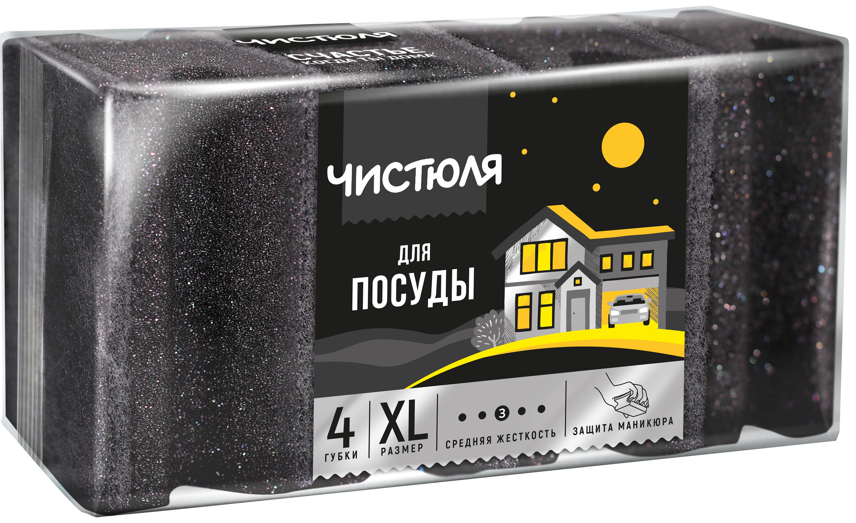 Абразив повышенной плотности и износостойкости - подходит для сильных загрязнений, для посуды без антипригарных покрытий и любых кухонных поверхностей. Эргономичный вырез-фаска для пальцев создает дополнительный комфорт и защиту ногтей. Размер XL: 96*64*43мм.