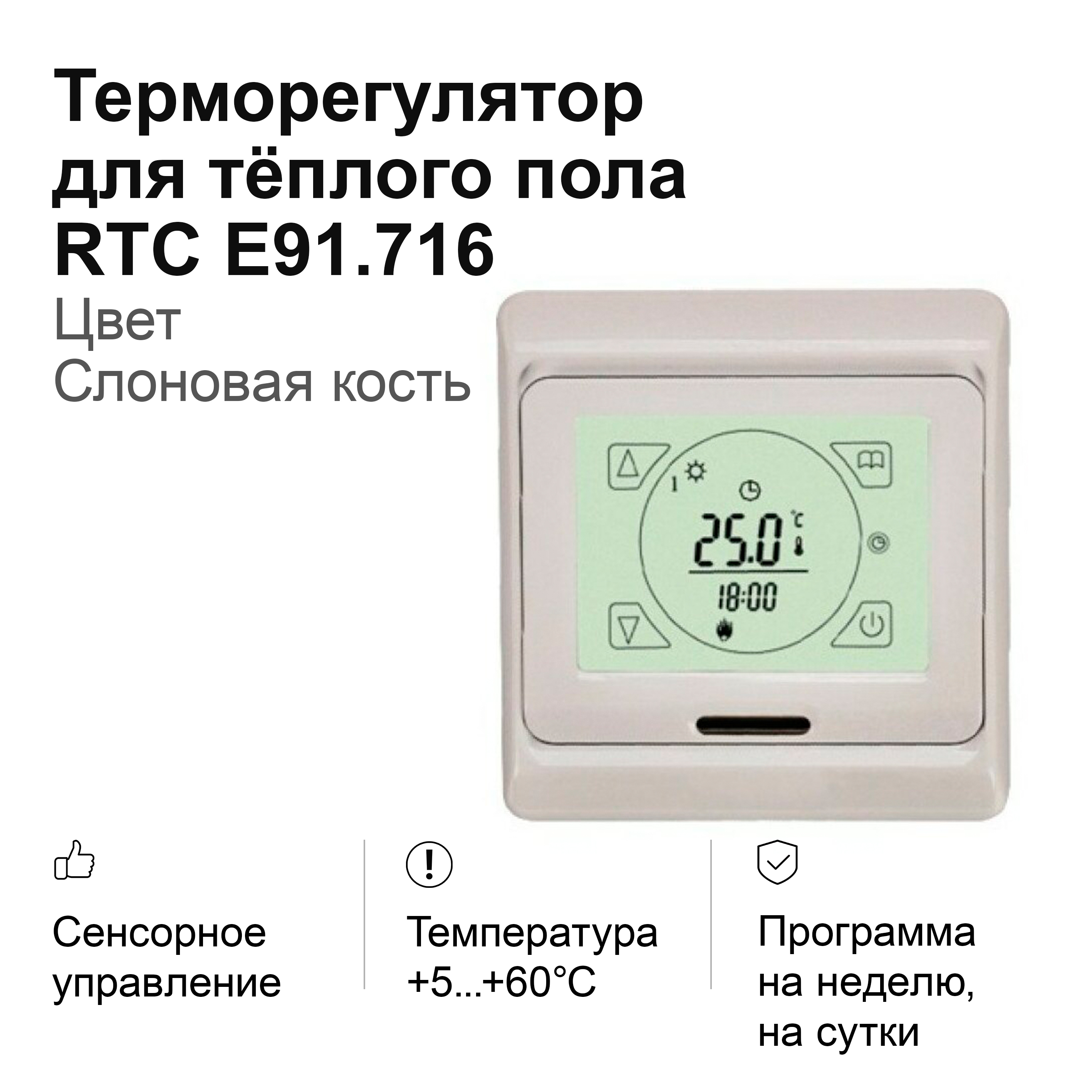 Терморегулятор RTC 91.716 предназначен для управления тёплыми полами (нагревательный мат, инфракрасная плёнка, кабельные секции) и отопительными приборами.