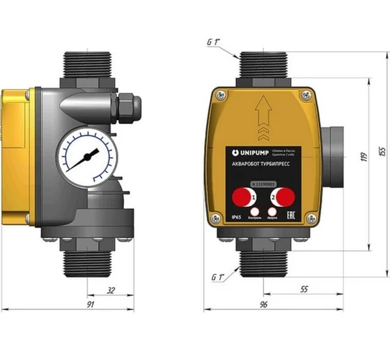 Блок управления насосом ТУРБИПРЕСС М2 UNIPUMP 73463 является универсальным блоком управления насосами, обеспечивающий их защиту. Функциональные возможности: Автоматическое включение насоса при снижении давления в системе ниже заданного порога Рмин; Автоматическое выключение насоса при достижении в системе давления Рмакс; Защита насоса от работы в режиме «сухого хода» и осуществляет серию пробных пусков для выхода из режима аварии; Защищает систему водоснабжения от избыточного давления более 10 бар; Стабильно работает при пониженном напряжении в электрической сети до 170 В. Электрическая сеть: 230 В, 50 Гц; Максимальная мощность насоса: 1.5 кВт; Максимальный рабочий ток: 16 А; Максимально допустимое давление: 10 бар; Перекачиваемая жидкость (свойства): - чистая вода - максимальный размер механических примесей: 1 мм; - температура: +5…+40 °С; Окружающая среда: - температура: +5…+40 °С; - влажность, не более 90±3%, при температуре 25±3 °С; Максимальная производительность насоса : 7.2 (120) м³/ч (л/мин); Присоединительные размеры (входной/выходной патрубок): 1 / 1 дюйм (наружная резьба); Степень защиты: IP65 Габаритные размеры (ДШВ): 155 × 96 × 91 мм; Масса нетто: 0.36 кг.