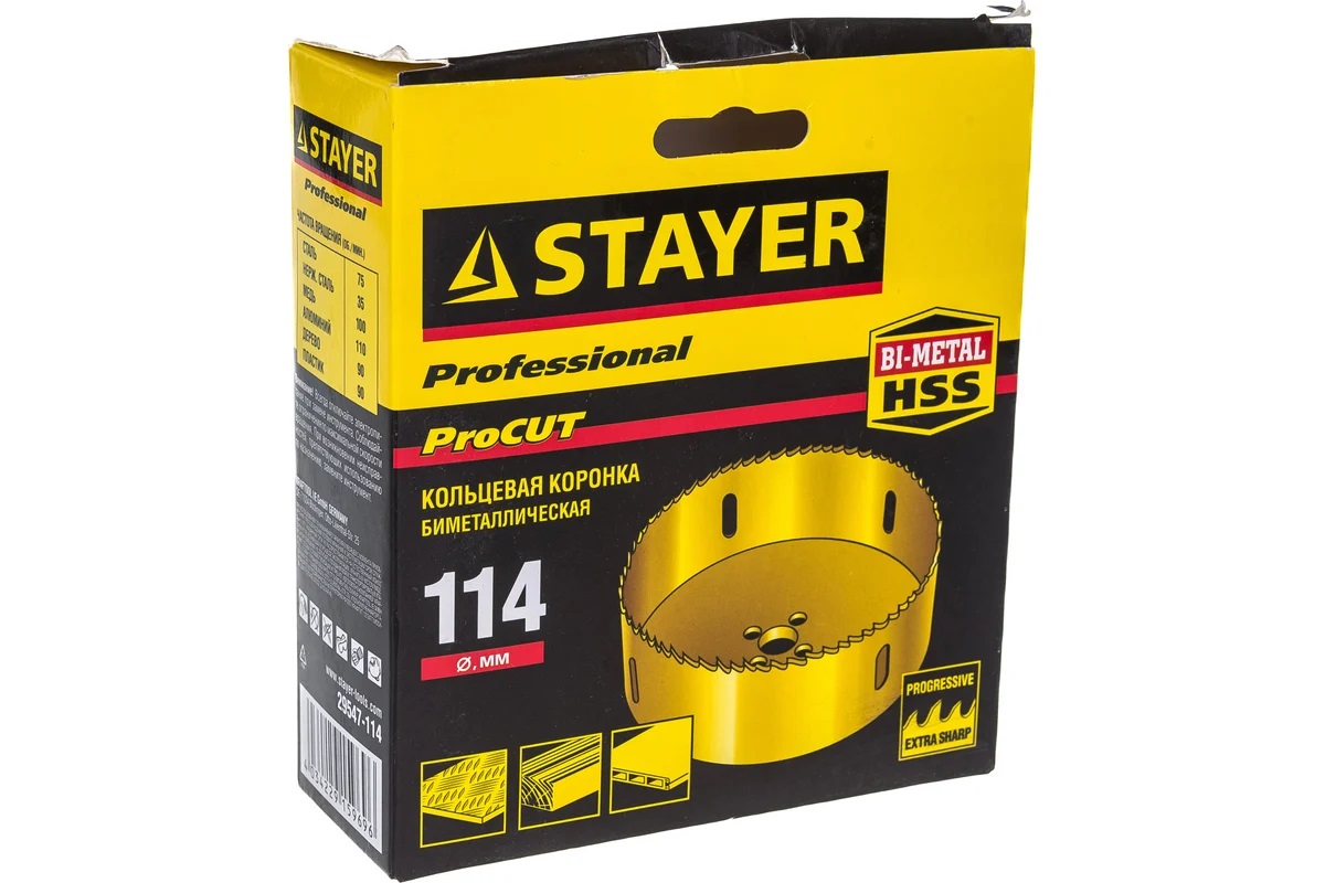 Универсальная биметаллическая коронка PROFESSIONAL STAYER 29547-114 применяется совместно с дрелями, перфораторами и стационарными станками. Предназначена для сверления в безударном режиме металла, дерева, ДСП, гипсокартона, алюминия и твердых пластмасс. Зубья изготовлены из быстрорежущей стали с 5% содержанием кобальта. Коронка обладает максимальной производительностью и высоким рабочим ресурсом. Зубья имеют особую заточку, что даёт усиленный захват материала и обеспечивает оптимальный отвод продуктов пиления. Соединение коронки 5/8 дюйма.
