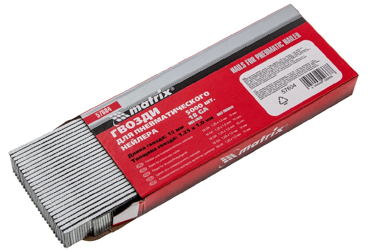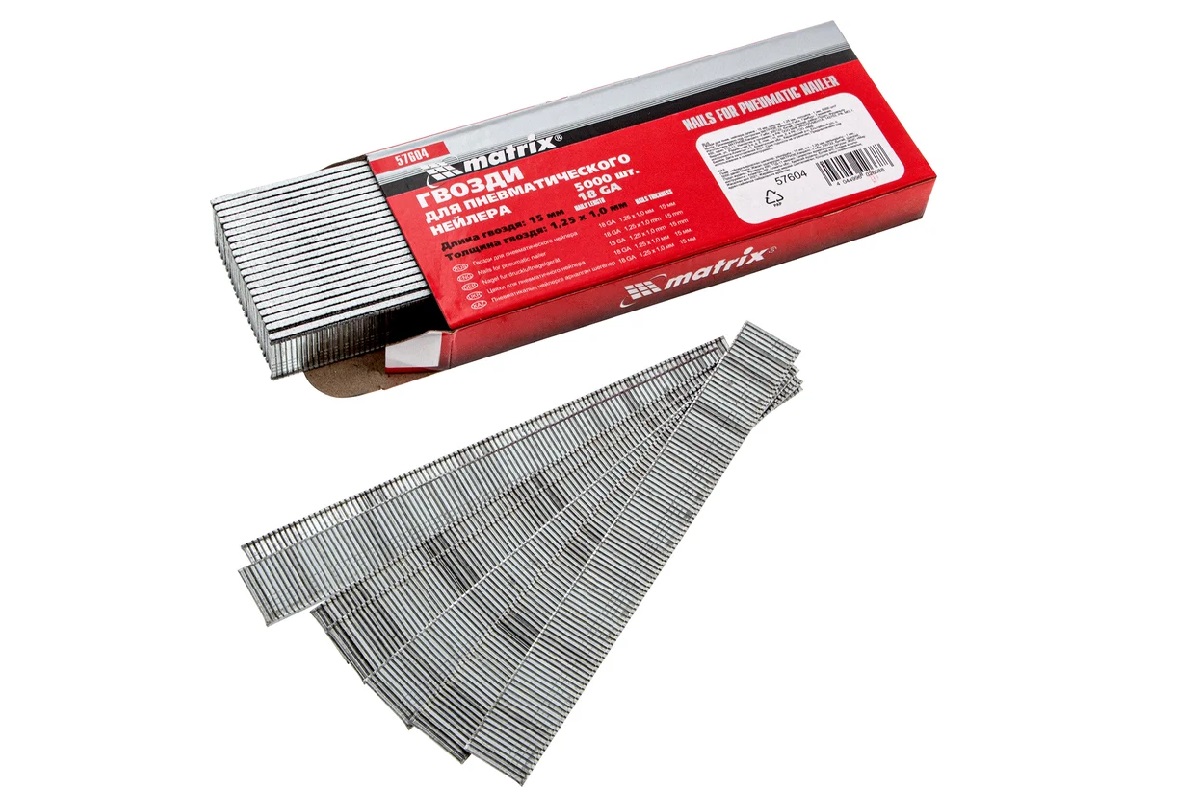 Гвозди Matrix 18GA 57604, 5000 шт. в упаковке, — крепежные элементы длиной 15 мм, шириной 1,25 и толщиной 1 мм, предназначенные для установки в пневматические нейлеры. С их помощью можно обить мебель, установить теплицу, закрепить плинтусы и настил.