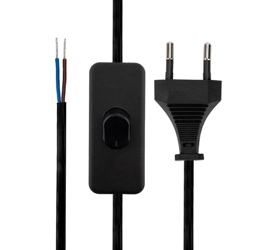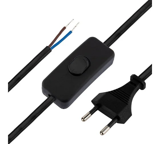 Сетевой шнур с выключателем предназначен для подключения бытовых приборов, осветительной техники и т. д. Шнур состоит из провода ШВВП сечением 0,75 мм², укомплектованного литой неразборной плоской вилкой (Евро), номинальным током 4 А, с подготовленными (зачищенными и лужеными) контактами, посередине провода расположен выключатель в корпусе из ABC пластика.