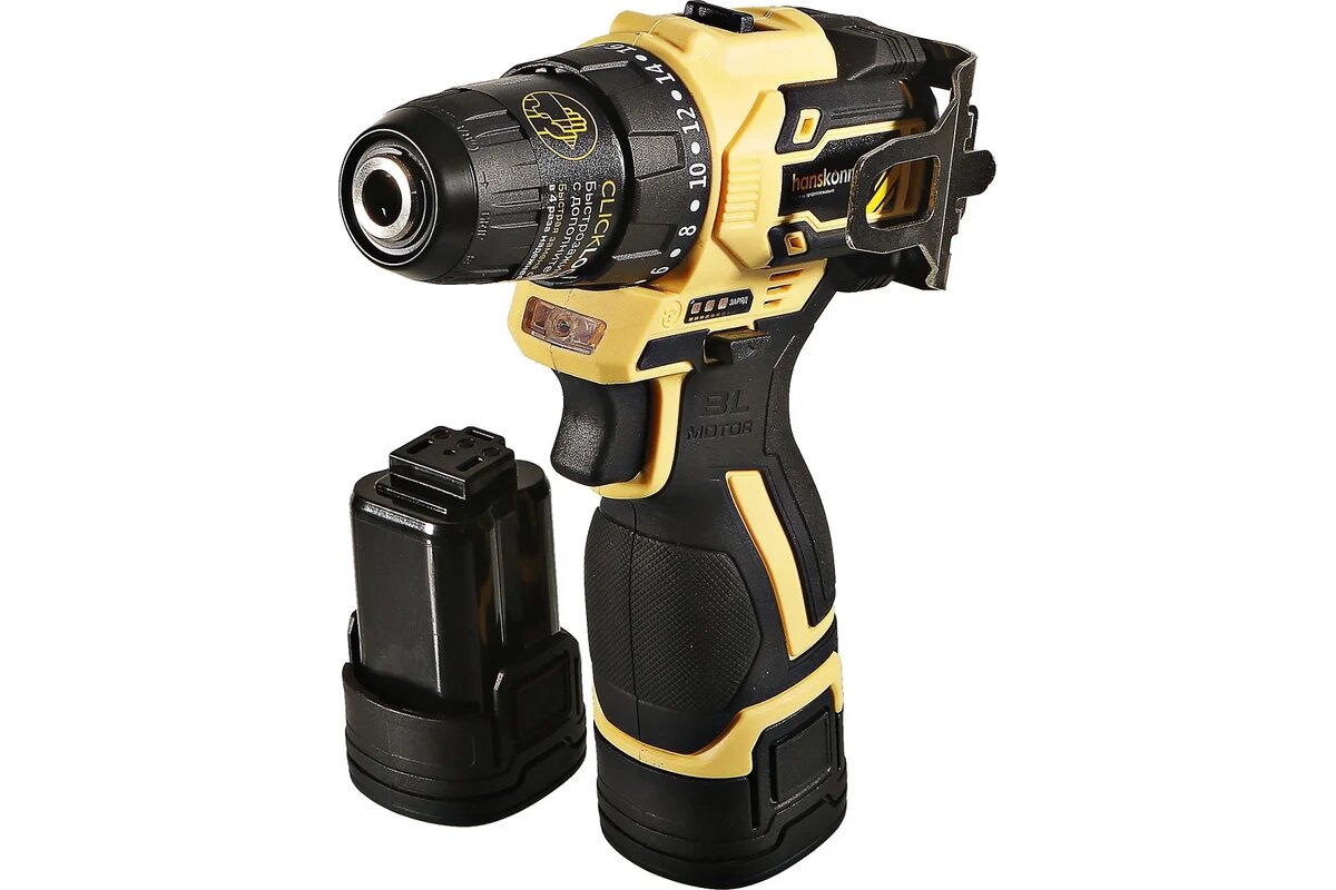 Аккумуляторная дрель-шуруповёрт. Аккумуляторная батарея (2 шт.). Зарядное устройство. Двусторонняя бита (3 шт.). Пластиковый кейс. Инструкция