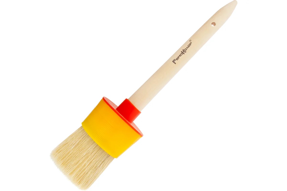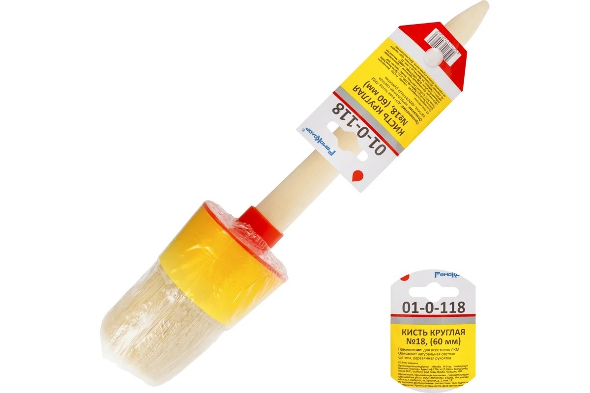 Круглая кисть №18, диаметр 60 мм РемоКолор 01-0-118 имеет натуральную щетину, которая обеспечивает равномерное нанесение лакокрасочных материалов на поверхность. Рукоятка выполнена из древесины, что обеспечивает комфорт в работе. Отверстие в рукоятке позволяет подвешивать инструмент. Длина щетины 50 мм.