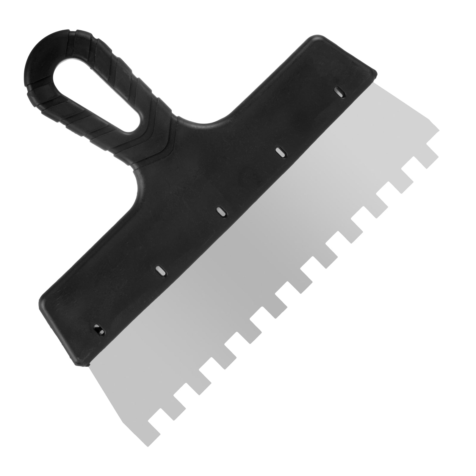 Шпатель фасадный «Мастер» от бренда «РемоКолор» (артикул 12-9-250) предназначен для нанесения и разравнивания плиточного клея на горизонтальных и вертикальных поверхностях. Полотно с зубьями 10х10 мм подходит для облицовки стен крупными плитами. Прочное полотно из нержавеющей стали позволяет наносить раствор с большой вязкостью.