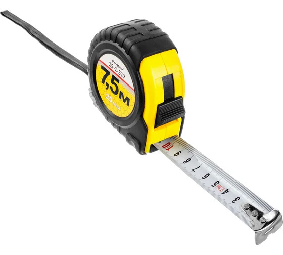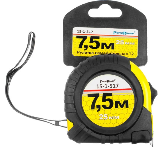Рулетка РемоКолор 15-1-517 — практичный инструмент для проведения измерений. Используется в отделочных, строительных, ремонтных работах. Изделие имеет обрезиненный компактный корпус из ABS-пластика, поэтому отличается прочностью. Лента длиной 7,5 м выполнена из стали и имеет трехслойное покрытие. Имеется двойной фиксатор ленты.
